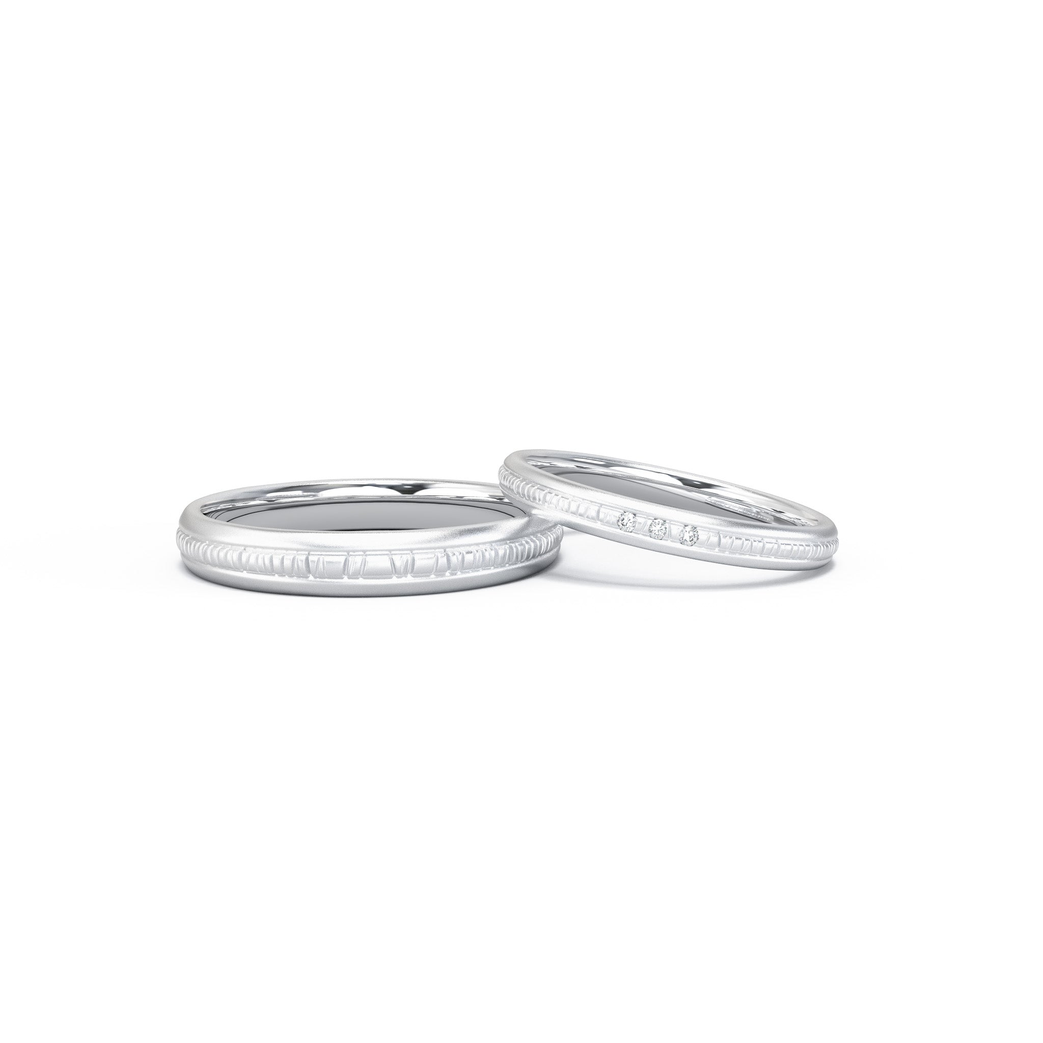 The Twilight Twig wedding ring set draws inspiration from the gentle silhouettes of tree branches at dusk, symbolizing the delicacy and harmony of nature. The men’s ring features a simple metal straight-line design with a sandblasted finish, showcasing a unique texture. The women’s ring complements this with the same sandblasted straight-line design, enhanced by three small diamonds elegantly set at the top, adding a touch of brilliance. This ring set perfectly combines modern style with timeless elegance, making it a precious symbol for your wedding ceremony.